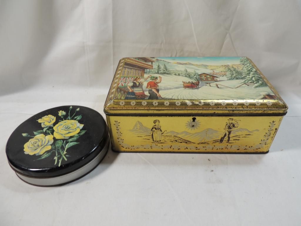 ROUND TIN WITH YELLOW ROSES LARGE WINTER ALPS THEME TIN. AS SHOWN. SEE PHOTO FOR MORE DETAILS.