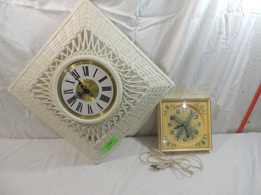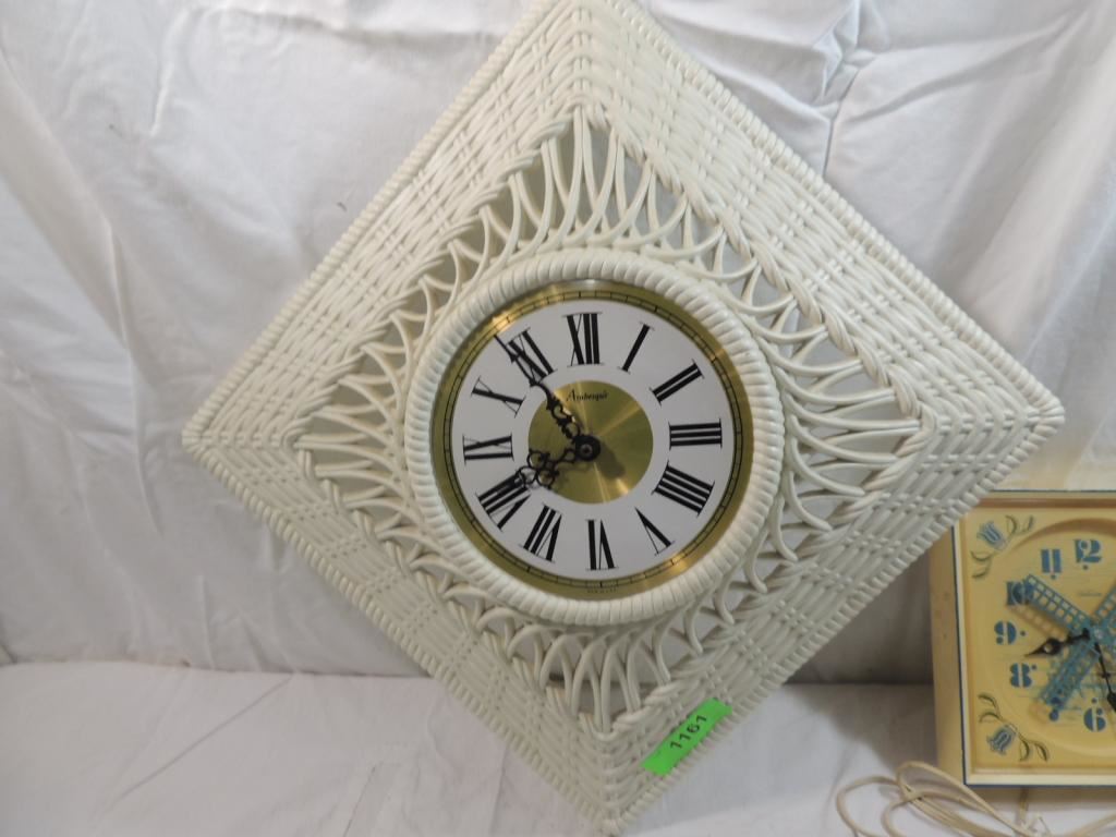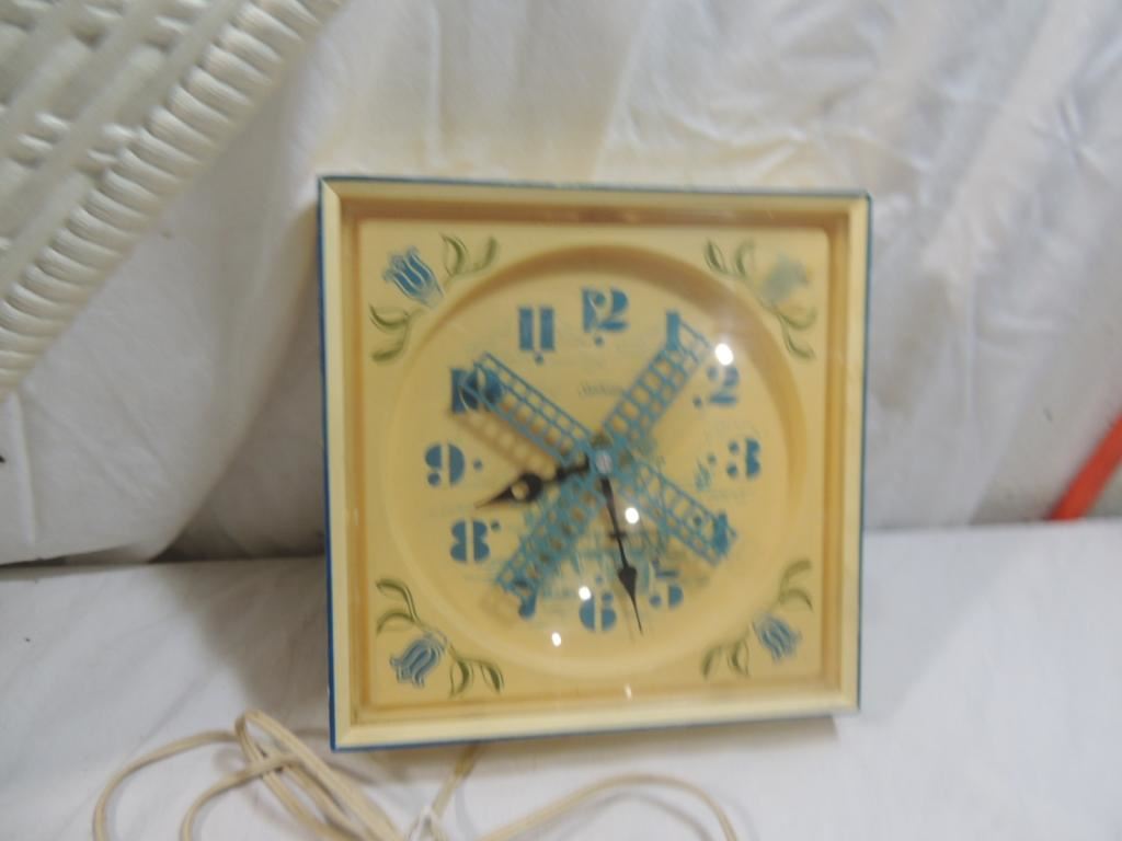 VINTAGE ARABESQUE BURNWOOD FAUX WICKER WALL CLOCK, WALL CLOCK, WINDMILL CLOCK, SWEDISH CLOCK, DUTCH CLOCK, SUNBEAM WALL CLOCK, COLLECTIBLE AS SHOWN SEE PHOTO FR MORE DETAILS.