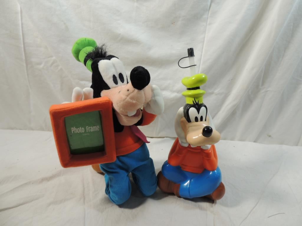 WATER BOTTLE, PLUSH PHOTO FRAME, DISNEY COLLECTIBLE, GOOFY MEMORAIBLA AS SHOWN SEE PHOTO FOR MORE DETAILS.