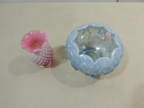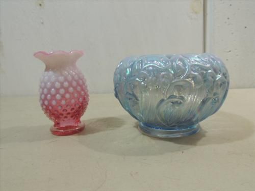 LOT 2 VINTAGE FENTON OPALESCENT BLUE BUD VASE & HOBNAIL SMALL PINK VASE. AS SHOWN. VIEW PICTURE FOR DETAIL.