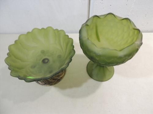 LOT 2 VINTAGE INDIANA GLASS CO FROSTED GREEN GLASS COMPOTE & PEDISTAL BOWL. AS SHOWN. VIEW PICTURE FOR DETAIL.