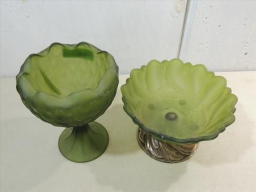 LOT 2 VINTAGE INDIANA GLASS CO FROSTED GREEN GLASS COMPOTE & PEDISTAL BOWL. AS SHOWN. VIEW PICTURE FOR DETAIL.