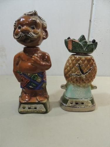 LOT 2 VINTAGE JIM BEAM WHISKEY CERAMIC DECANTERS: 1972 GOLF HAWAIIAN OPEN, 1975 GOLF 10TH ANNV HAWAIIAN OPEN (HAS SMALL CHIP ON HEAD).  AS SHOWN.  VIEW PICTURE FOR DETAIL.
