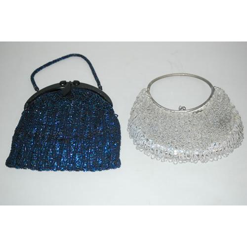 LOT (2) VINTAGE LADIES PURSES - (1) SILVER SEQUINS &<BR>CLEAR GLASS BEADS ON A LOOPED CHASED METAL HANDLE &<BR>(1) BLUE METALLIC BEADS ON A FAUX SHELL FRAME - LOSSES<BR>& BREAKS, IMPERFECTIONS