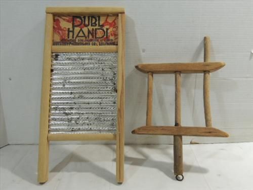 LOT 2 VINTAGE LAUNDRY TOOLS: CLOTHES LINE REWINDER & DUBL HANDI WASH BOARD. AS SHOWN. VIE WPICTURE FOR DETAIL,.