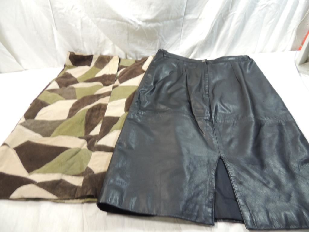 SIZE 10 & 12 LEATHER SKIRT, BLACK AND PATCHWORK SKIRT AS SHOWN SEE PHOTO FOR MORE DETAILS.