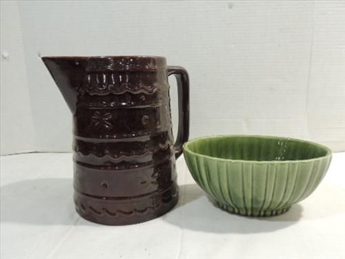 LOT 2 VINTAGE MARCREST STONEWARE PITCHER & HAEGER 4020 PLANTER. AS SHOWN. VIEW PICTURE FOR DETAIL.
