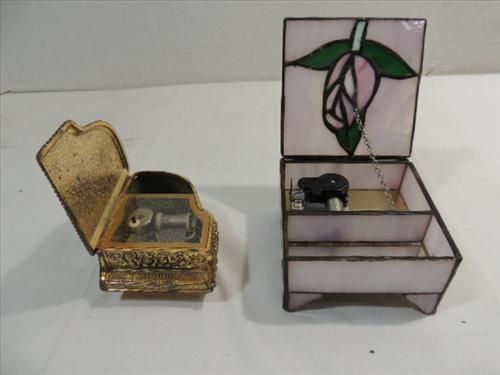 LOT 2 VINTAGE MUSIC BOXES: PIANO & STAIN GLASS. AS SHOWN. VIEW PICTURE FOR DETAIL.
