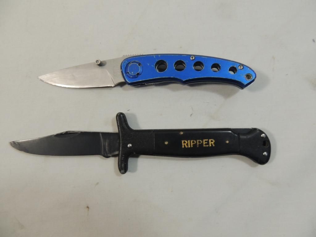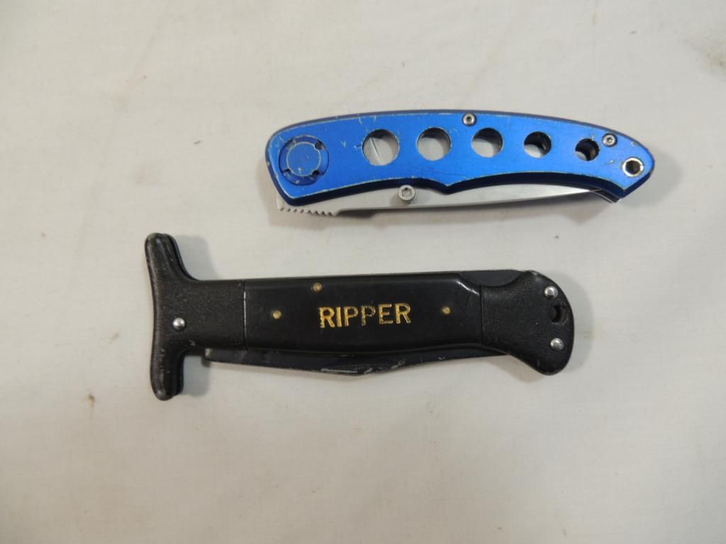 SPORTS AFIELD BLUE POCKET KNIFE AND VINTAGE RIPPER POCKET KNIFE COLLECTIBLE. AS SHOWN SEE PHOTO FOR MORE DETAILS.