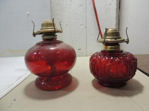 LOT 2 VINTAGE RUBY RED GLASS KEROSENE STORM LAMPS. AS SHOWN. VIEW PICTURE FOR DETAIL.