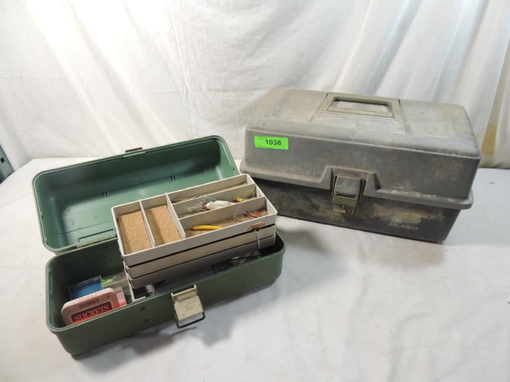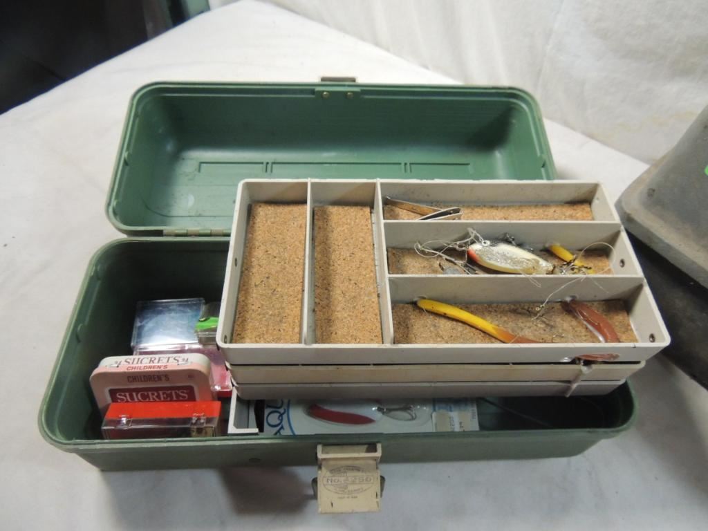 SMALL VINTAGE TACKLE BOX WITH MISC FISHING GEAR, LURES, FISHING ACCESSORIES, LARGER TACKLE BOX EMPTY, AS SHOW SEE PHOTO FOR MORE DETAILS.