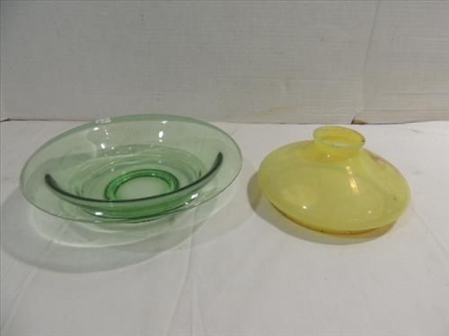 LOT 2 VINTAGE VASELINE GLASS BOWLS 9"D & 7"D. A SSHOWN. VIEW PICTURE FOR DETAIL.