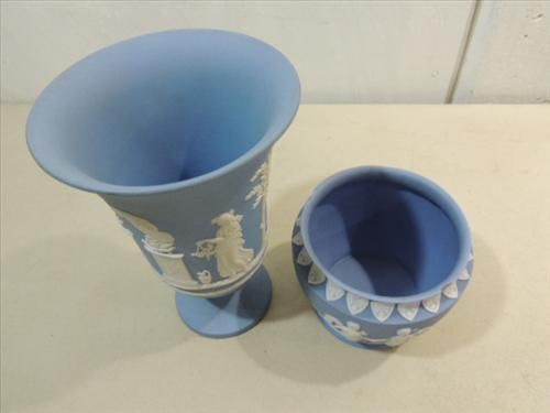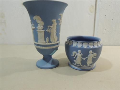 LOT 2 VINTAGE WEDGEWOOD CAMEO STEM VASE & BUD VASE. THE BUD VASE HAS 2 SMALL CHIP ONRIM. AS SHOWN. VIEW PICTURE FOR DETAIL.