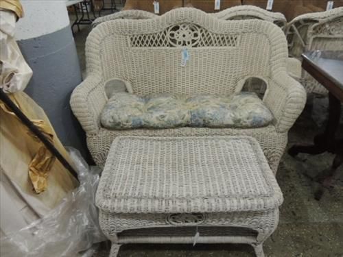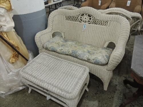 LOT 2 VINTAGE WICKER PATIO FURINTURE: 51" LOVE SEAT & 30X18X18 TABLE. AS SHOWN. VIEW PICTURE FOR DETAIL.
