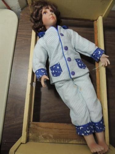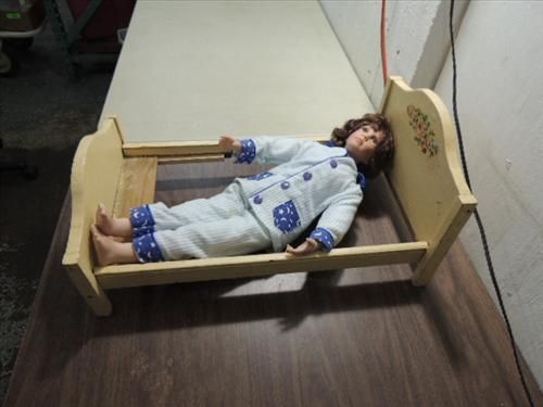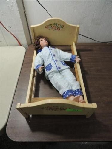 LOT 2 VINTAGE WOOD HAND PAINTED BABY DOLL BED & 2006 AEL VINYL 23" TALL GIRL DOLL ARTIST SIGNED. AS SHOWN. VIEW PICTURE FOR DETAIL.