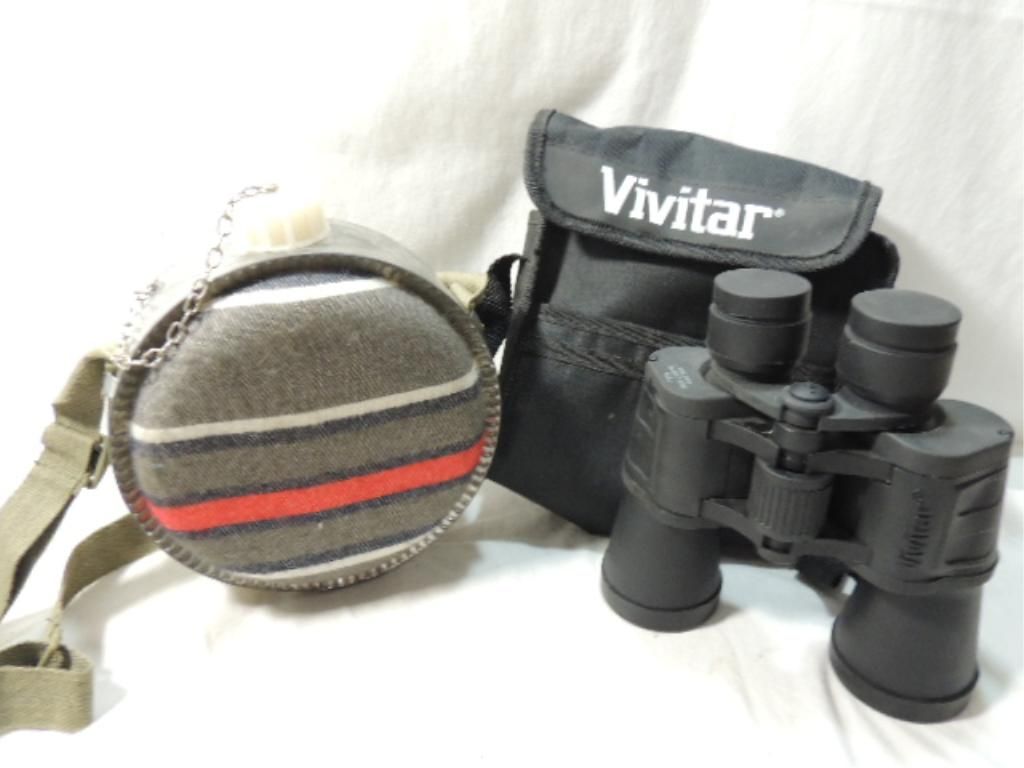 VIVITAR BINOCULARS AND VINTAGE CANTEEN. AS SHOWN SEE PHOTO FOR MORE DETAILS