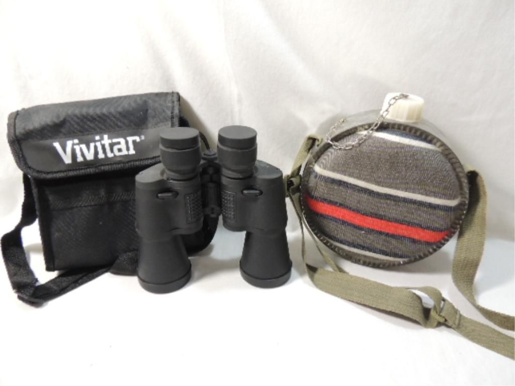 NICE VIVITAR BINOCULARS AND VINTAGE CANTEEN IN GREAT CONDITION. AS SHOWN SEE PHOTO FOR MORE DETAILS