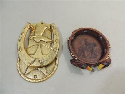 LOT 2 WESTERN STYLE HORSESHOE DOOR KNOCKER & GUN BELT ASH TRAY. AS SHOWN. VIEW PICTURE FOR DETAIL.