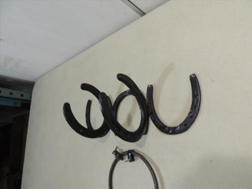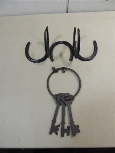 LOT 2 WESTERN SYLE DECORATIVE ITEM: HORSESHOE COAT RACK & FAUX SKELTON KEYS ON A RING. AS SHOWN. VIEW PICTURE FOR DETAIL.