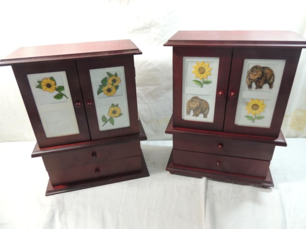LOT 2 WOODEN DOLL CABINET, WARDROBE, JEWELRY BOX