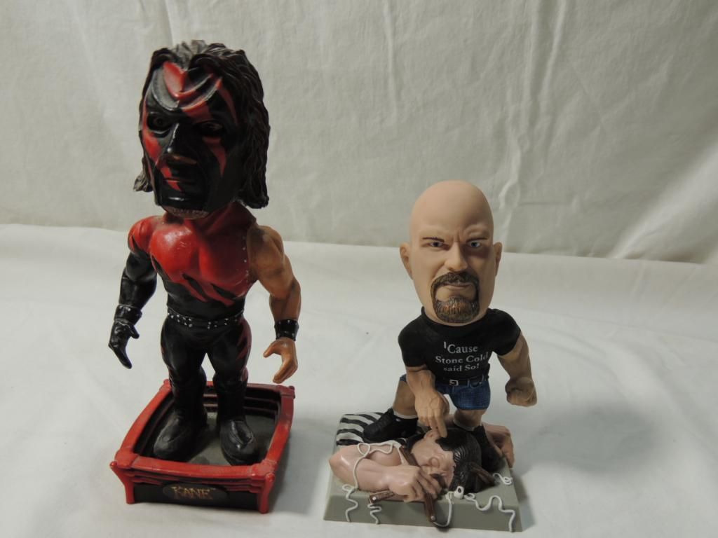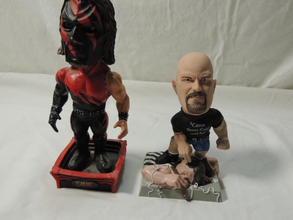 BOBBLE HEADS WWE WRESTLER KANE AND STONE COLD. COLLECTIBLE AS SHOWN SEE PHOTO FOR MORE DETAILS.