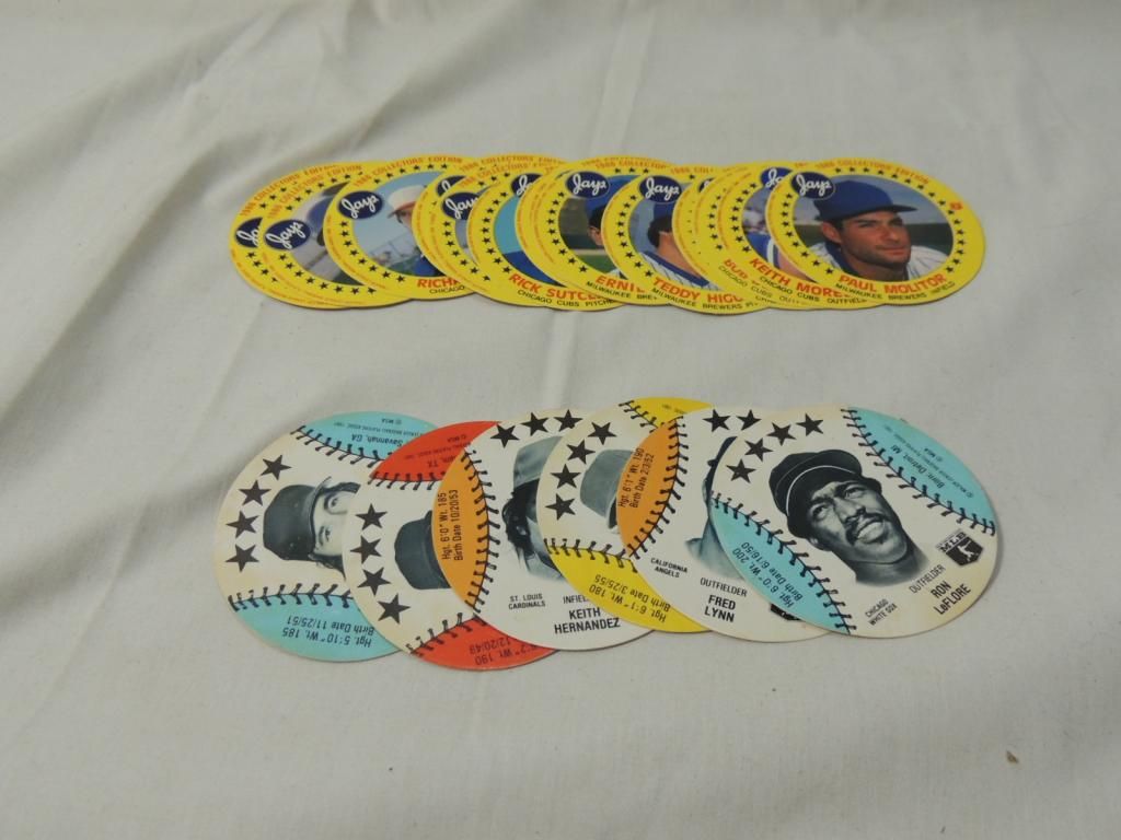 LOT 20 1981& 1986 JAYS COLLECTORS BASEBALL DISC CARDS. 1981 PETER PAN DISC BASEBALL PLAYER CARDSAS SHOWN. VIEW PICTURE FOR DETAIL