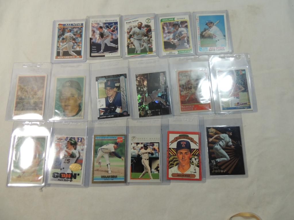 MIXED MAKERS AND YEARS REGGIE JACKSON, JOSE CANSECO, GREG MADDUX, KEN FRIFFEY JR. DAVE LOPES, GOOD CONDITION. IN SLEEVE. TRADING CARDS. COLLECTIBLE. AS SHOWN. SEE PHOTO FOR MORE DETAILS.