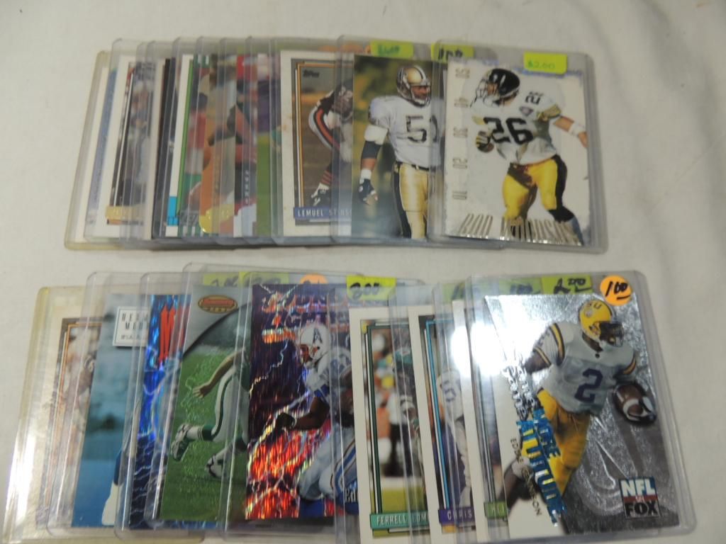 MIXED MAKERS AND MIXED DATES. FOOTBALL PLAYER CARDS. TRADING CARDS. FOOTBALL COLLECTIBLE. GOOD CONDITION. PROTECTIVE SLEEVES. SPORTS FOOTBALL MEMORABILIA. AS SHOWN SEE PHOTO FOR MORE DETAILS.