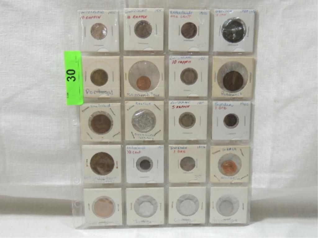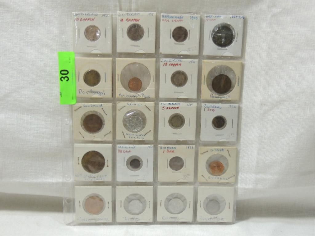 EUROPEAN AND FOREIGN COINS IN COLLECTOR PAGE.MIXED DATES 1871-1938. SWITZERLAND, NETHERLANDS, VIET-NAM, PORTUGAL, CONGO, AND MORE. AS SHOWN. SEE PHOTO FOR DETAILS.