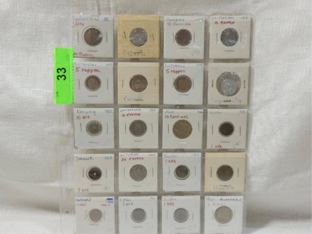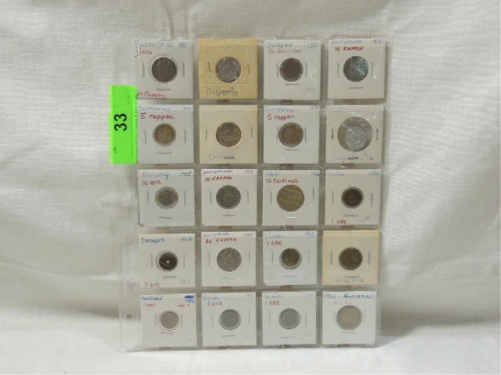 EUROPEAN AND FOREIGN COINS IN COLLECTOR PAGE. MIXED DATES 1849-1955 SWEDAN, HAITI, NORWAY, GUATEMALA, MORE. AS SHOWN. SEE PHOTO FOR DETAILS.