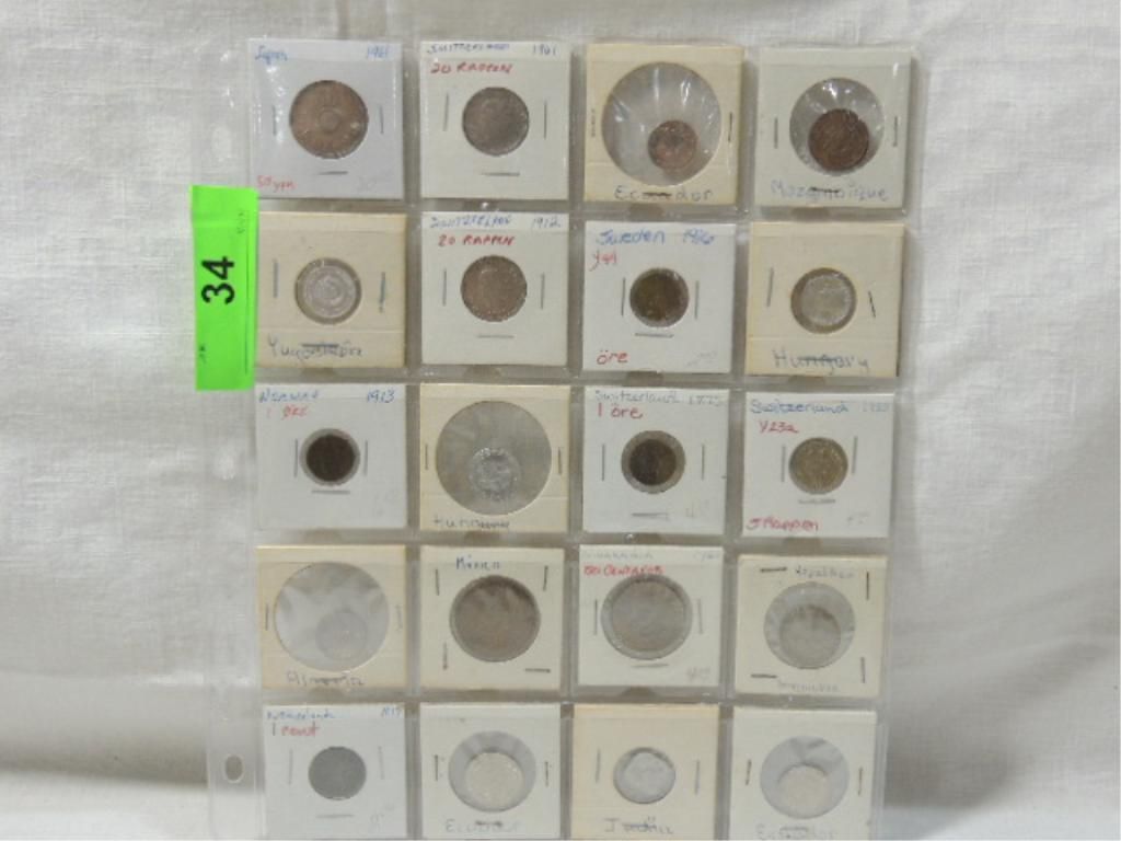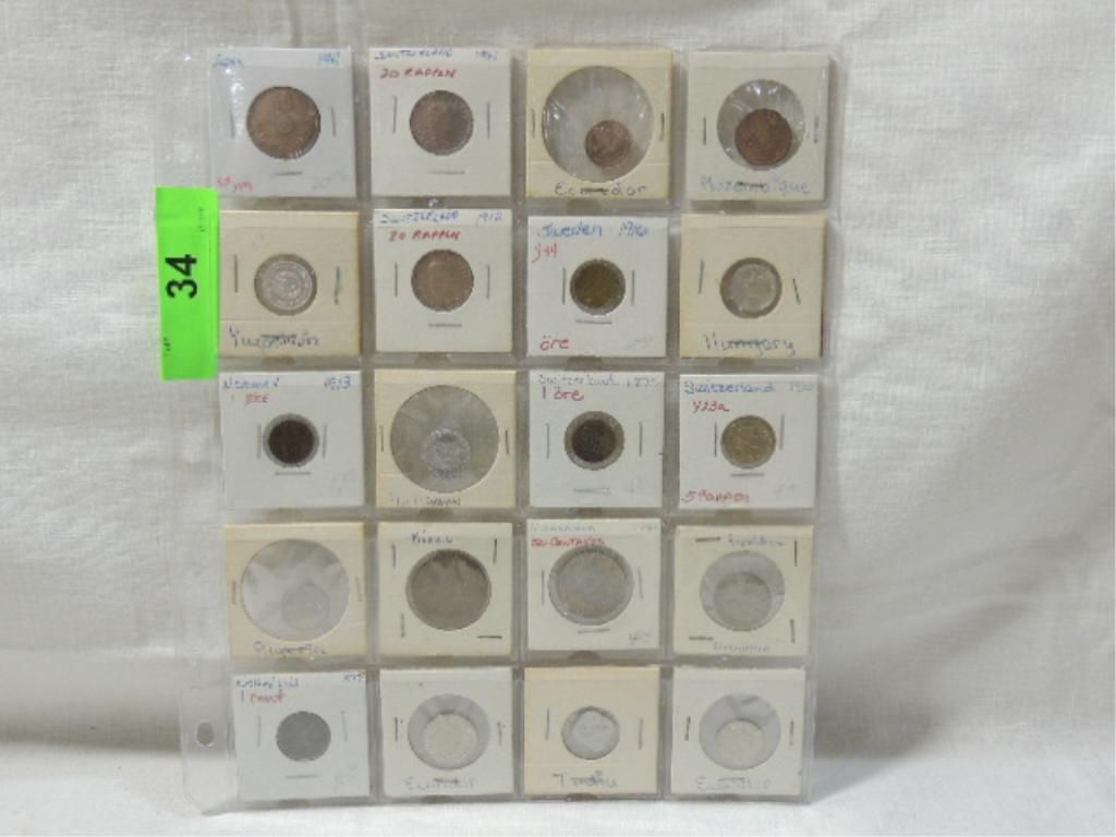 EUROPEAN AND FOREIGN COINS IN COLLECTOR PAGE. MIXED DATES 1877-1961 JAPAN, SWITZERLAND, ECUADOR, HUNGARY, SWEDEN, NETERLANDS,