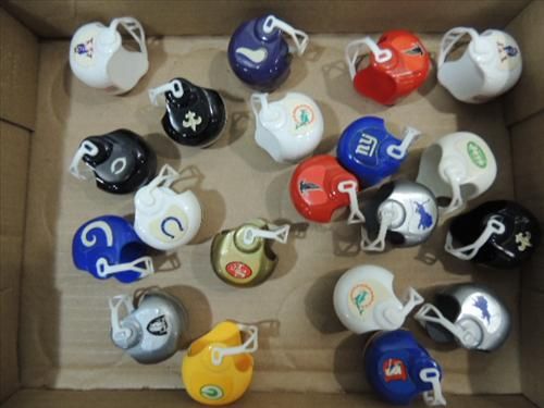 LOT 20 FOOTBALL MINI PLASTIC HELMETS. AS SHOWN. VIEW PICTURE FOR DETAIL.