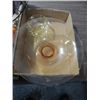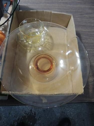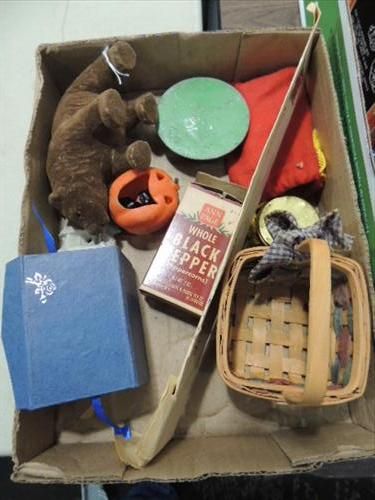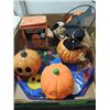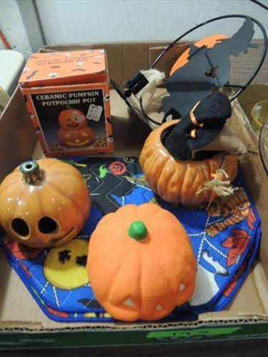 LOT 20 HOLLOWEEN TABLE DECORATIONS: 4 CERAMIC PUMPKINS, YELLOW DEPRESSION CUP & SAUCER, MID CENTURY MODERN DECORATIVE GLASS BOWL, METAL WITCH CANDLE HOLDER AND PLACEMAT, WATCH OPENER KEY, BEAR, MINIATURE BASKET, HAND WARMER, SPICE BOX AND MUCH MORE. AS SHOWN. VIEW PICTURE FOR DETAIL.