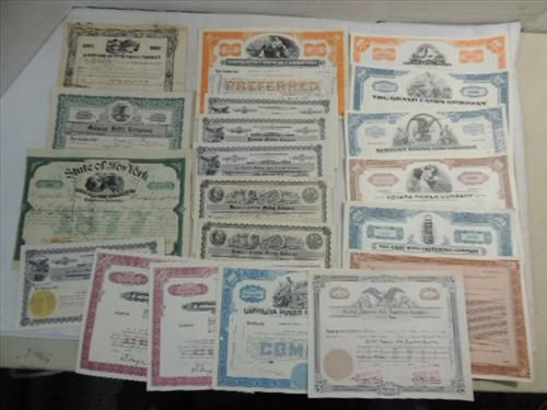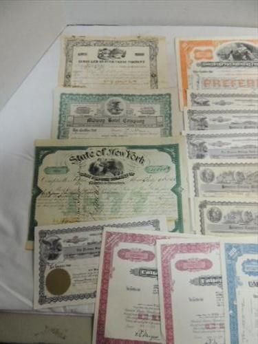 LOT 20 VINTAGE COMPANY STOCK CERTIFICATES: 1846 SANDY & BEAVER CANAL COMPANY,1930 MIDWAY HOTEL COMPANY, 1866 STATE OF NEW YORK AND MUCH MORE. AS SHOWN. VIEW PICTURE FOR DETAIL.