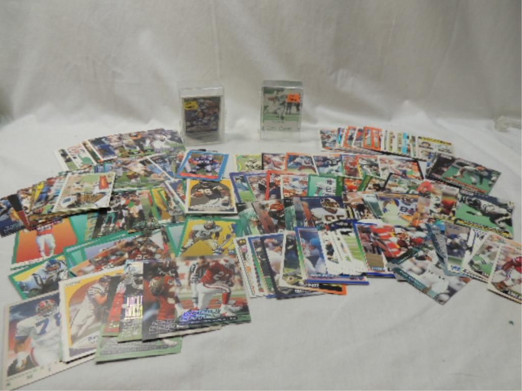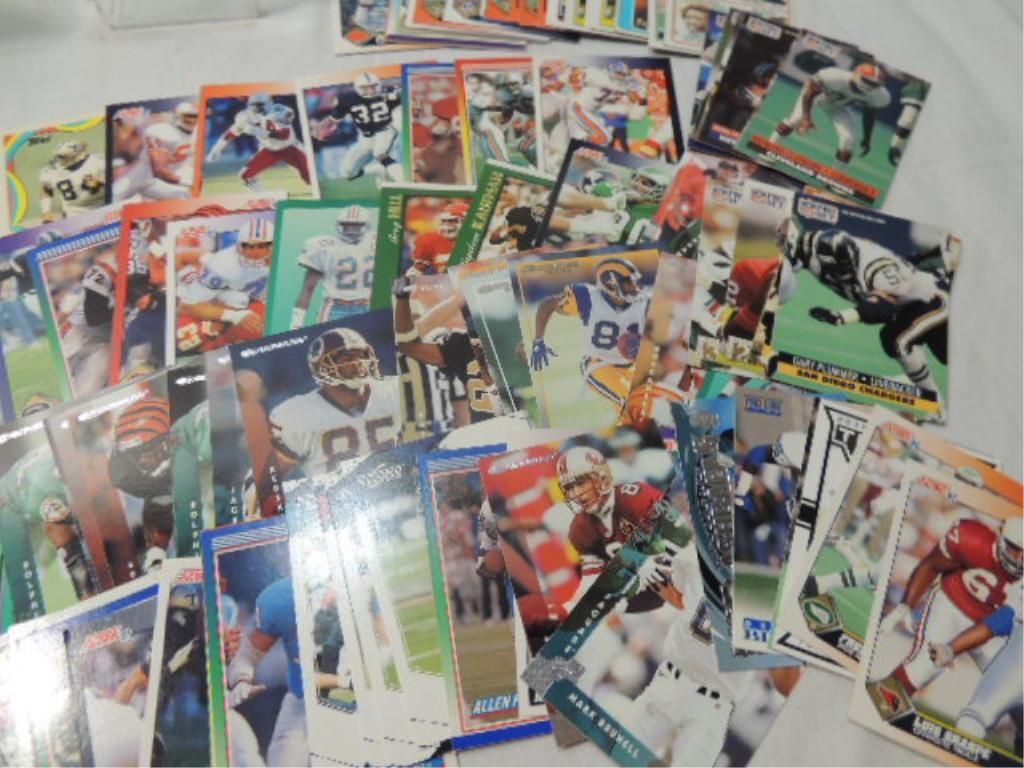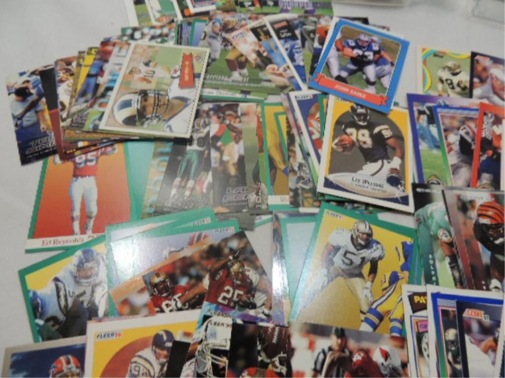 IN PLASTIC BOXES, UNGRADED. SEE PHOTOS FOR MORE. FOOTBALL PLAYER CARDS. TRADING CARDS. AS SHOWN.