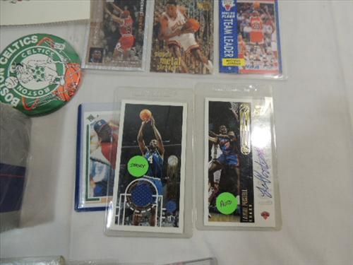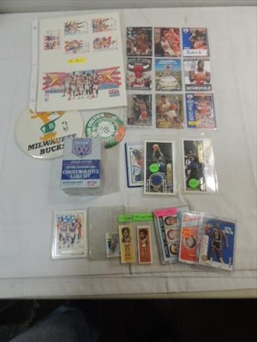 LOT 18 ASSORTED BASKETBALL COLLECTIBLE CARDS: JORDAN. PIPPEN, JOHNSON, JERRY WEST AND MORE, 2 VINTAGE BASKETBALL PINS: BUCKS & CELTICS & PRO SET COMMEMORATIVE FOOTBALL CARD SET. AS SHOWN. VIEW PICTURE FOR DETAIL.