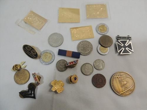LOT 13 (9) FOREIGN COINS & 4 GOLD FOIL US POSTAGE STAMPS, LAPEL PINS: MILITARY, GIRL SCOUTS & MORE. AS SHOWN. VIEW PICTURE FOR DETAIL.