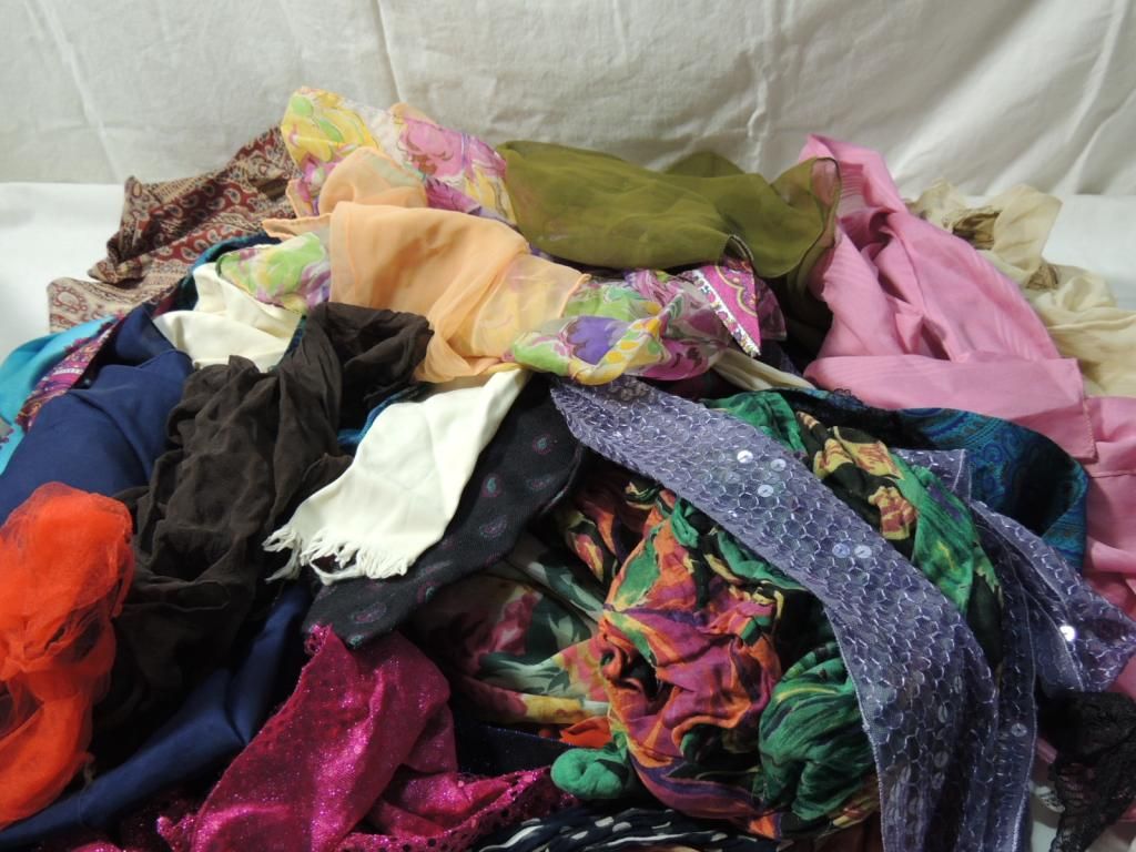 ASSORTED SCARVES. COLORFUL, SOLID COLOR, PATTERNED, PAISLEY, FLORAL, POKA DOTS, AS SHOWN. SEE PHOTO FOR MORE DETAILS.