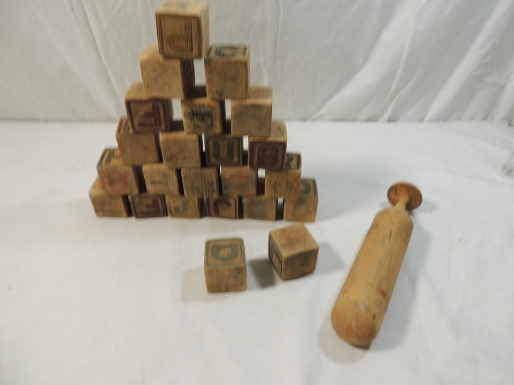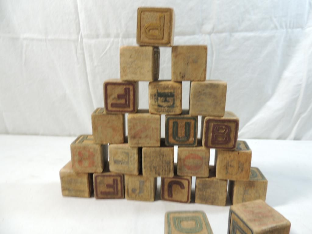 VINTAGE WOODEN PLAY LETTER BLOCKS CHILDRENS TOY BABY TOY DECORATIVE LETTER BLOCKS AS SHOWN SEE PHOTO FOR MORE DETAILS.