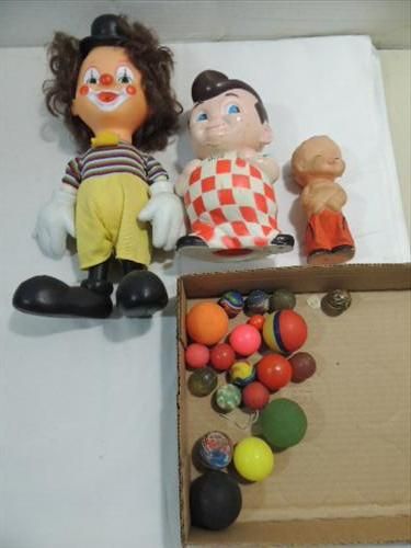 LOT 23 VINTAGE TOYS: 20 RUBBER JACKS PICKUP BALLS, BOBS BIG BOY COIN BANK, CLOWN AND SQUEAKY TOY. AS SHOWN. VIEW PICTURE FOR DETAIL.