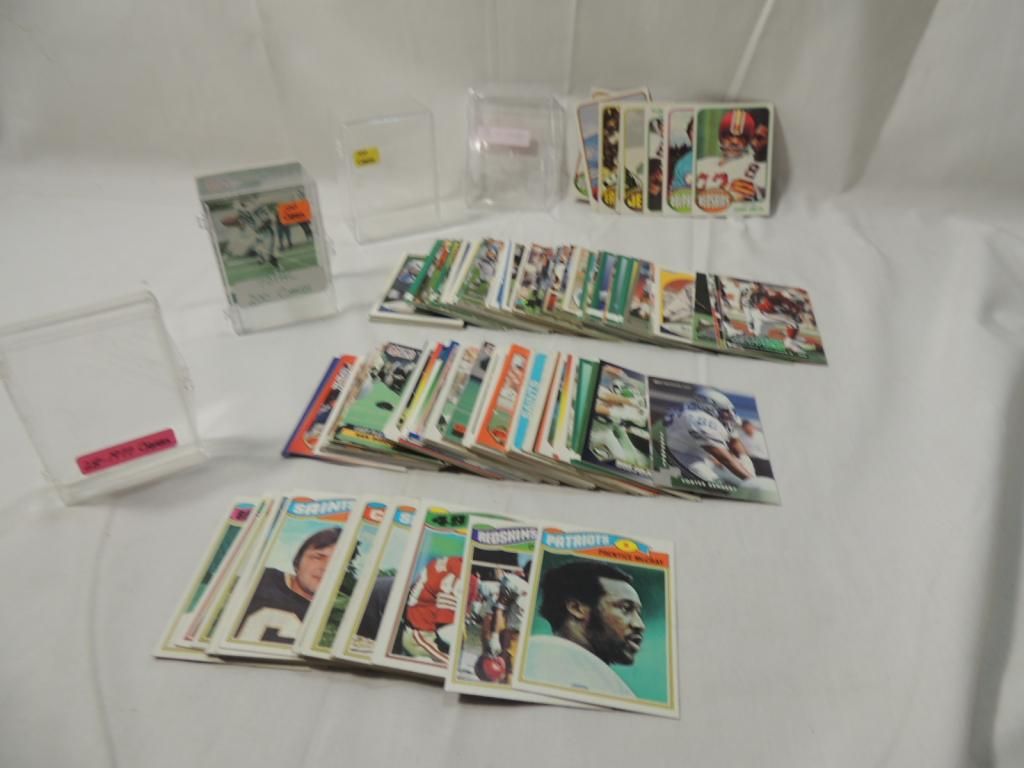 IN PLASTIC BOXES, MIXED MAKERS AND DATES. UNGRADED. SEE PHOTOS FOR MORE. FOOTBALL PLAYER CARDS. TRADING CARDS. AS SHOWN.