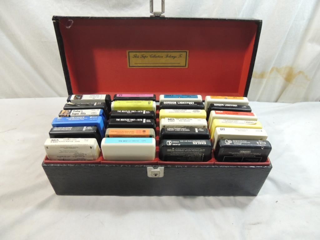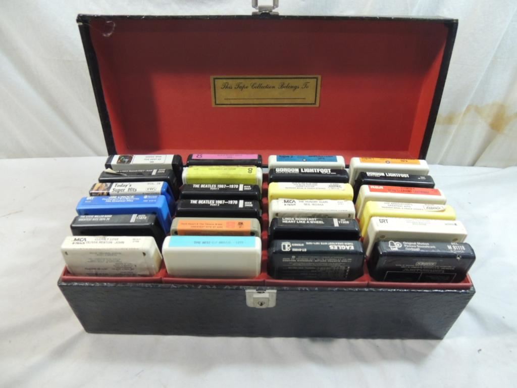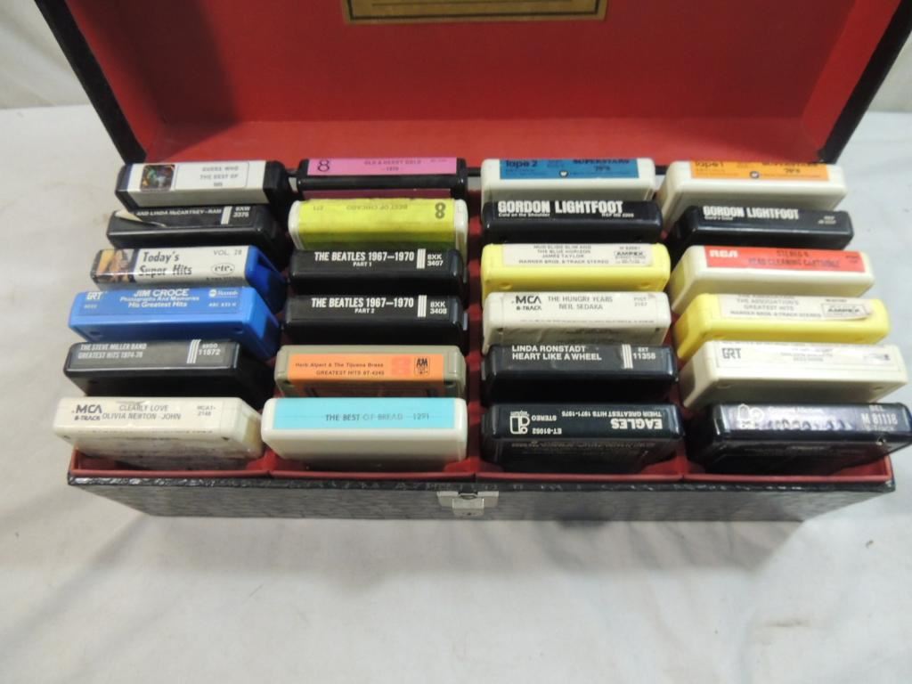 STORAGE CASE, 8-TRACK CASE, LEATHER CASE, STORAGE CASE, EAGLES, GODSPELL, GORDON LIGHTFOOT, BEATLES, OLIVIA NEWTON JOHN, AS SHOWN SEE PHOTO FOR MORE DETIALS.