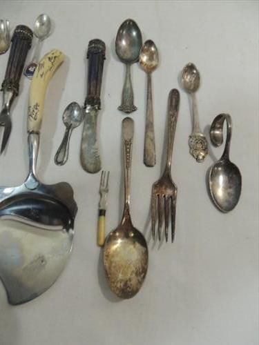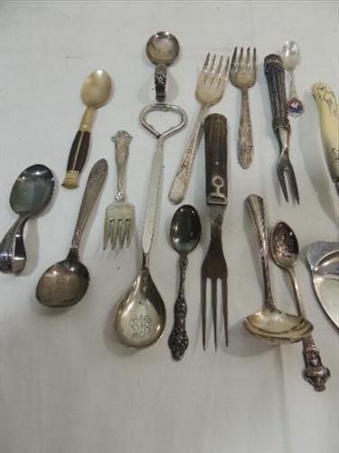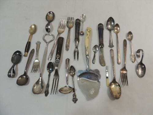 LOT 24 VINTAGE ASSORTED FLATWARE: FEW SILVER PLATE. AS SHOWN. VIEW PICTURE FOR DETAIL.