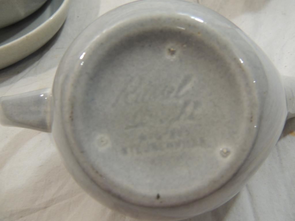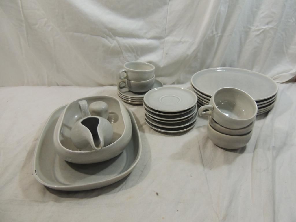 GRAVY BOAT, SERVING PLATE, VEGGIE BOWL, SALT SHAKER, 5 CUPS, 6 SAUCERS, 5 DESERT PLATES, 6 DINNER PLATES, POTTERY PLATES, DINNERWARE, ANTIQUE DINNERWARE AS SHOWN SEE PHOTO FOR MORE DETIALS.