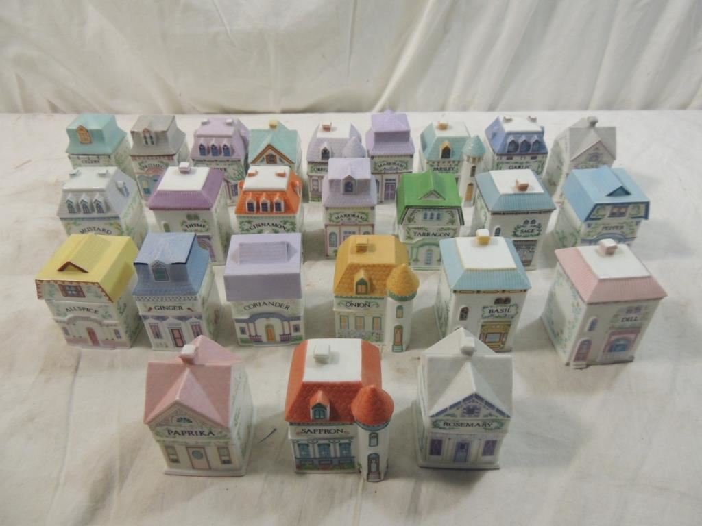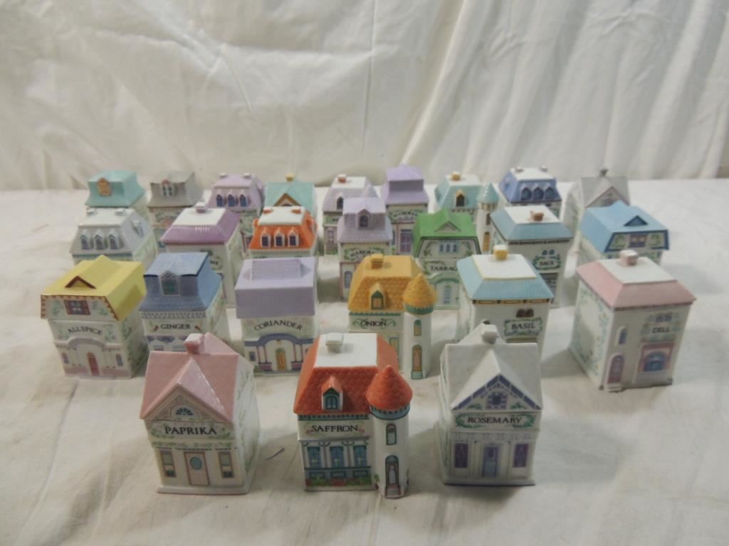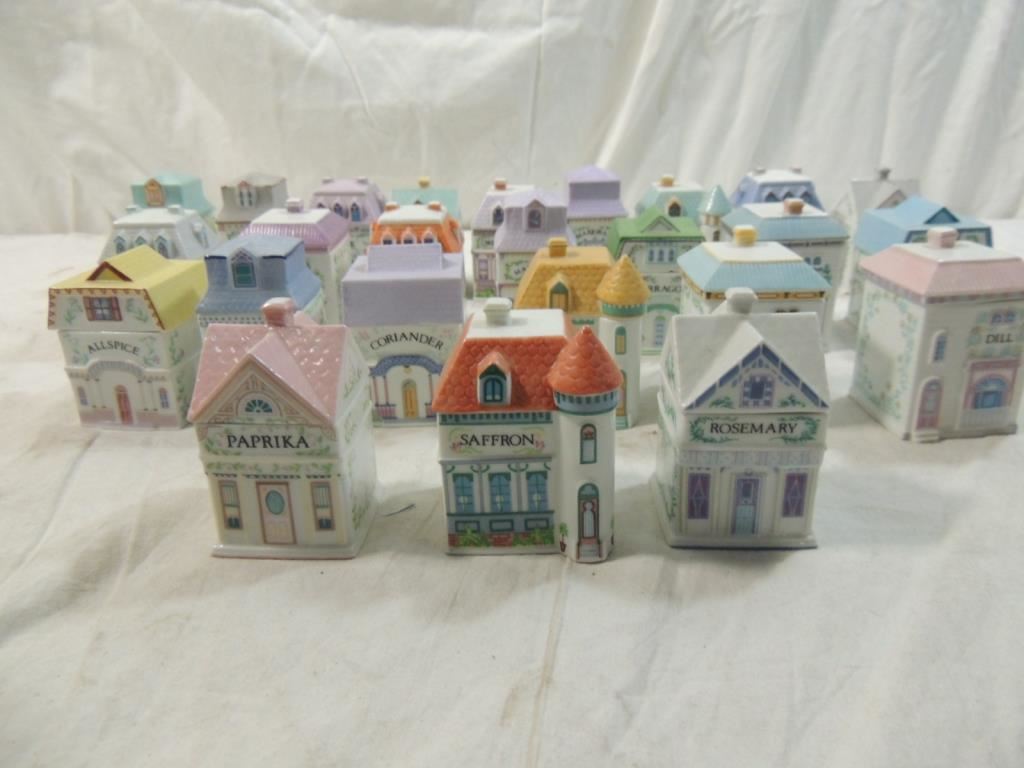 THE LENOX SPICE VILLIAGE SET, FINE PORCELAIN, COLLECTIBLE, DETAILIED, DECORATIVE, SPICE JARS, HOUSE SPICE JARS, AS SHOWN SEE PHOTO FOR MORE DETAILS.