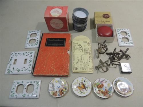 LOT 26 VINTAGE COLLECTIBLES: 6 SILVER PLATED NAPKIN HLDERS, 6 BALL TIN LIDS, 5 CERMC OUTLET COVERS, 4 SMALL DECORATIVE PLATES, TRAVEL ALARM CLOCK AND MORE. AS SHOWN. VIEW PICTURE OFR DETAIL.