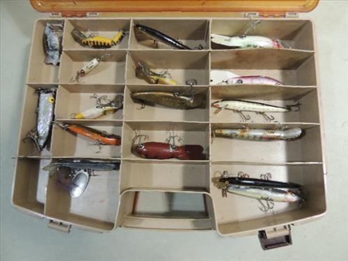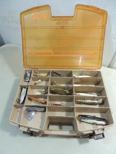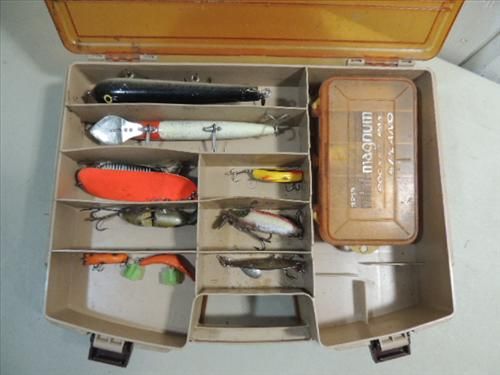 LOT 26 VINTAGE FISHING LURES & FENWICK TACKLE BOX. AS SHOWN. VIEW PICTURE FOR DETAIL.