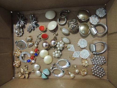 LOT 27 (22 PAIR) VINTAGE LADYS MATCHING EARRINGS & 5 PINS. ALL EARRING RINGS ARE CLIP ON. AS SHOWN. VIEW PICTURE FOR DETAIL.