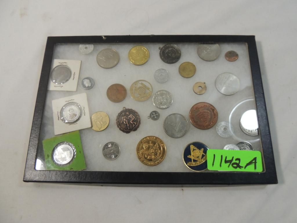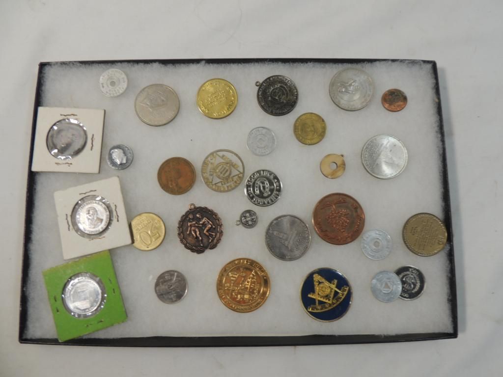 ASSORTED COINS & PENDANTS, VINTAGE CLUB COLLECTIBLES, VINTAGE COIN COLLECTIBLE. CURRENCY COLLECTIBLE. GOOD CONDITION. AS SHOWN SEE PHOTO FOR MORE DETAILS.