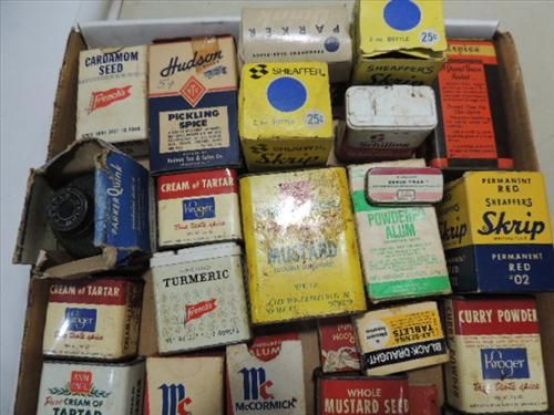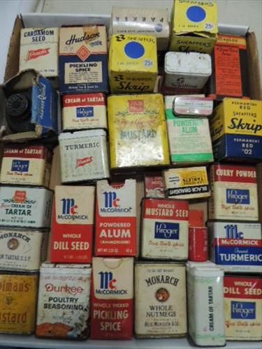 LOT 29 VINTAGE TIN, GLASS & CARDBOARD SPICE HOLDERS. MCCORMICK, FRENCHS, MONARCH AND MORE. AS SHOWN. VIEW PICUTRE FOR DETAIL.